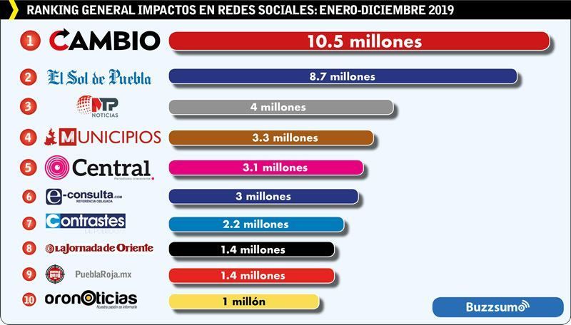 Con 10.5 millones de impactos en redes sociales y 40 millones de visitas, el portal de noticias de Diario CAMBIO se convirtió en el más visitado en Puebla durante 2019, superando a la página de noticias de El Sol de Puebla, que obtuvo 8.7 millones de impactos de acuerdo con el software especializado en la medición de tráfico Buzzsumo.