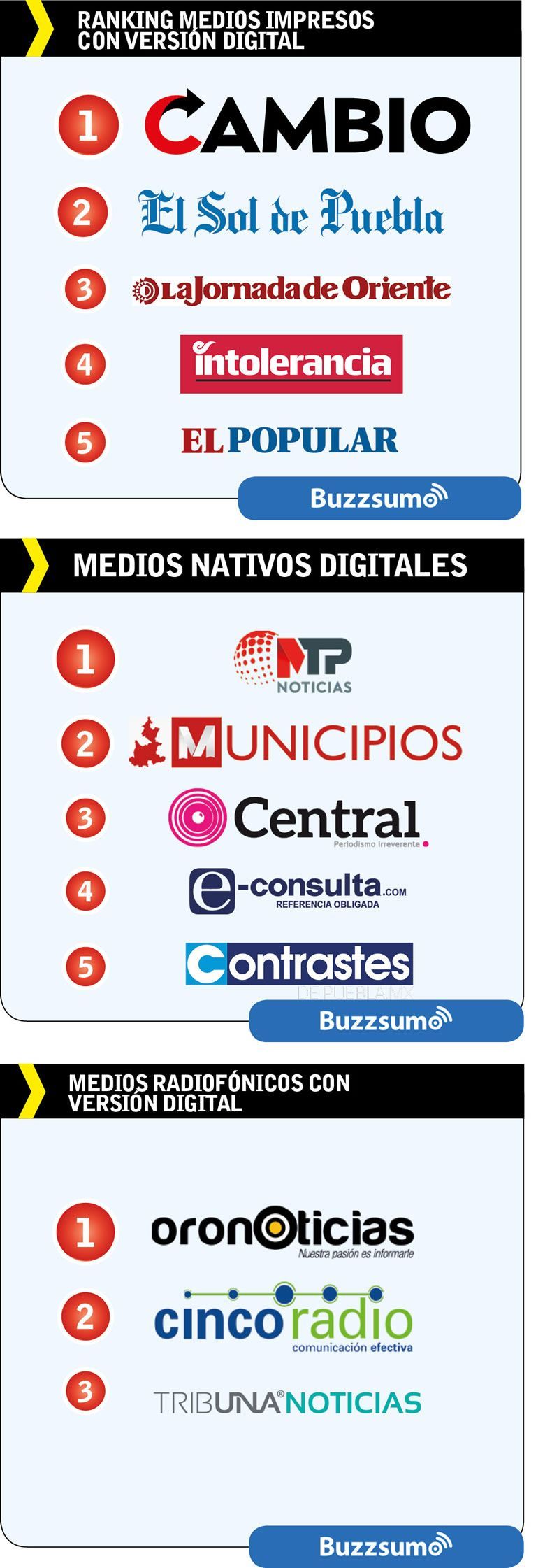 Tomando en cuenta a los medios impresos con versión digital, el ranking lo domina Diario CAMBIO, seguido de El Sol de Puebla, La Jornada de Oriente, Intolerancia Diario y El Popular.