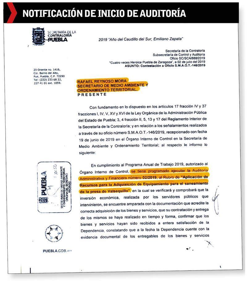 El 2 de julio del 2019, el funcionario envió el oficio al secretario de Medio Ambiente para especificar que se tenía programada la “Auditoría Administrativa y Financiera número 02/2019, al Rubro de ‘Aplicación de Recursos para la Adquisición de Equipamiento para el saneamiento de la presa Valsequillo’”.