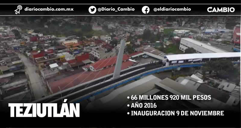 Finalmente, este listado lo concluye el puente de Teziutlán, que con una inversión total de 66 millones 920 mil pesos, fue inaugurado el 9 de noviembre de 2016.