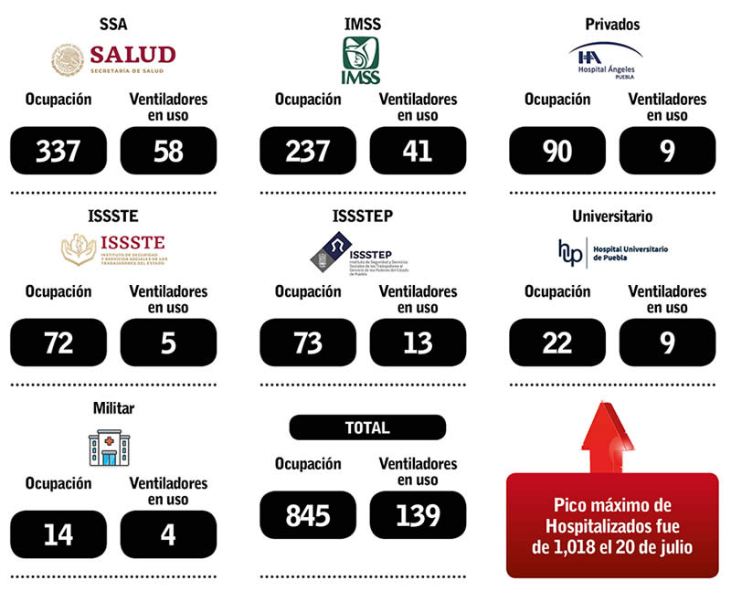 Por otra parte, el titular de la SSA detalló que en todo Puebla habilitaron hasta este día mil 389 camas para pacientes con coronavirus en hospitales públicos como privados, es decir que contempla la SSA, IMSS, Issste, Issstep, el Universitario, Militar y los Privados, de las cuales hay ocupadas 845 para este día, es decir, 61 por ciento del total.