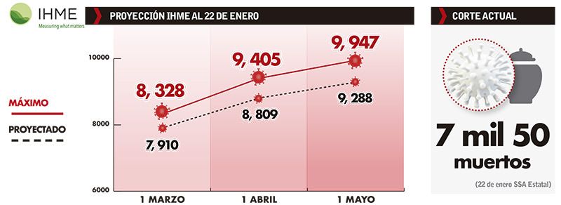 De acuerdo con el reporte del 22 de enero de la Secretaría de Salud Estatal, hay 7 mil 50 muertos por COVID-19, lo que significaría que la tendencia durante los próximos días y todo el mes de febrero se mantendría en un nivel alto, reflejo de la letalidad que ha crecido durante este 2021.