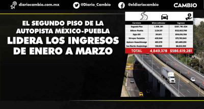 El Segundo Piso de la Autopista México-Puebla, que fue concesionado durante el gobierno de Rafael Moreno Valle a las empresas Pinfra-Aleatica, es el que mayores ingresos tuvo con 822 millones mil 576 pesos, teniendo una afluencia de cinco millones 744 mil 786 vehículos durante el 2022.