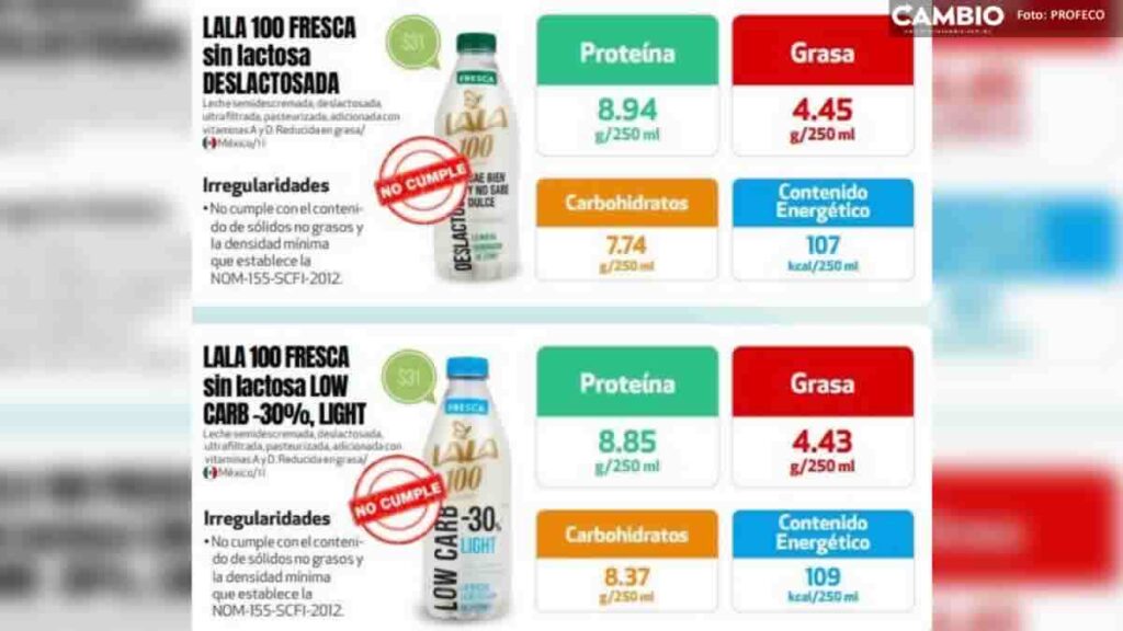 Las leches Lala 100 Fresca sin lactosa Deslactosada y Lala 100 Fresca sin lactosa Low Carb -30% Light no cumplieron con los estándares de sólidos no grasos y densidad mínima de la NOM-155-SCF1-2012 según Profeco.
