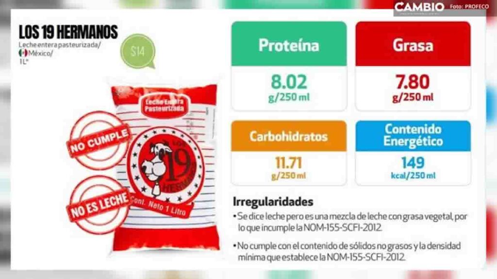 Los 19 Hermanos no cumple los estándares de calidad de la NOM-155-SCFI-2012 en cuanto a los sólidos no grasos y la densidad mínima de la leche.