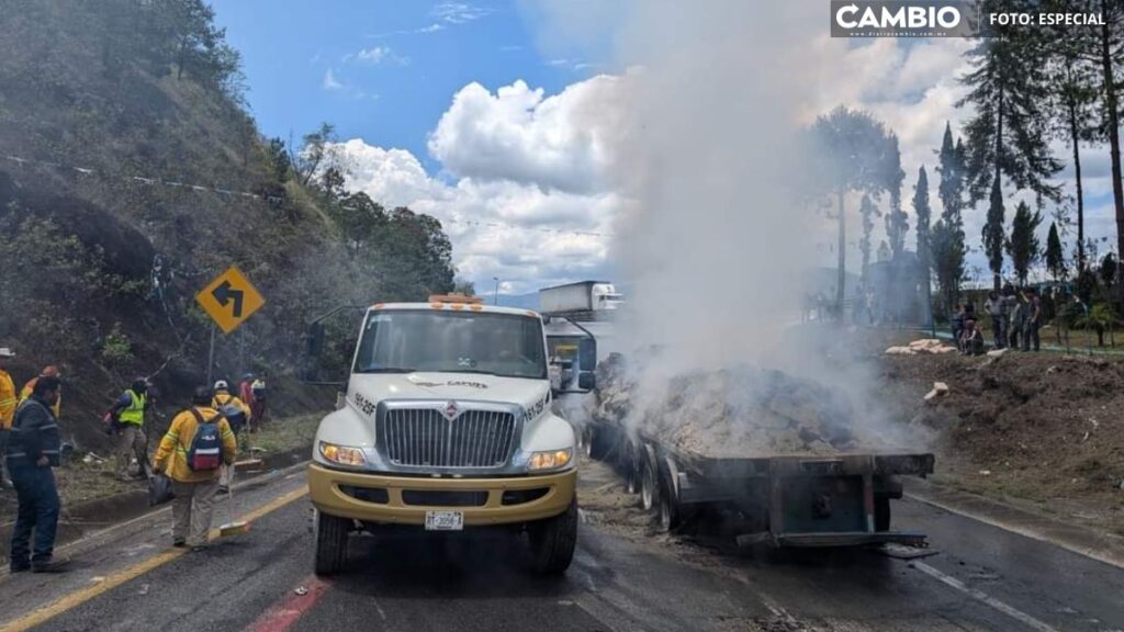 Daños materiales por varios miles de pesos y actos de rapiña dejó el choque por alcance e incendio de un tráiler que transportaba 30 toneladas de cemento en la autopista Puebla-Orizaba.