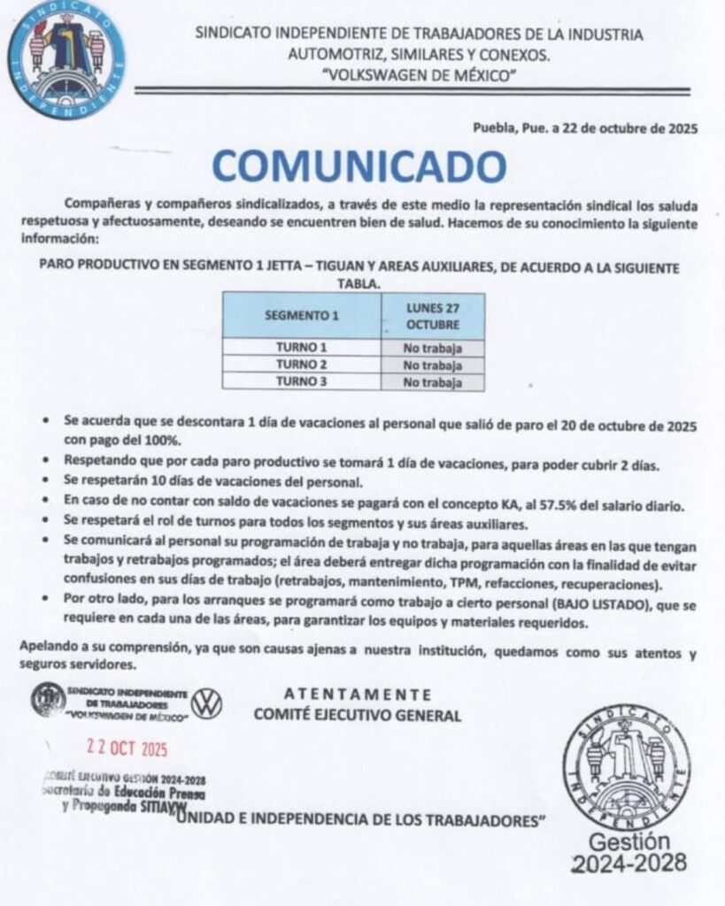 El Sindicato Independiente de Trabajadores de la Industria Automotriz Volkswagen de México (SITIAVW) confirmó un nuevo paro técnico para el lunes 27 de octubre en la planta armadora de Cuautlancingo, que afectará al Segmento 1 Jetta-Tiguan y sus áreas auxiliares en los tres turnos de producción.
