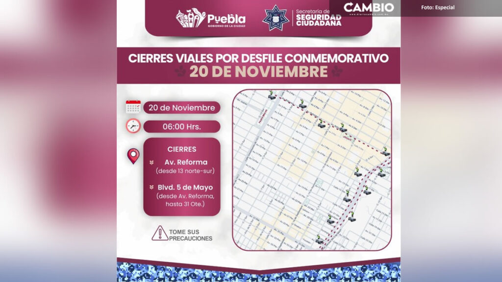De acuerdo con las autoridades, los cierres viales iniciaran a las seis de la mañana del jueves 20 de noviembre en la avenida Reforma, desde la 13 Norte-Sur, y en el bulevar 5 de Mayo hasta la 31 Oriente.