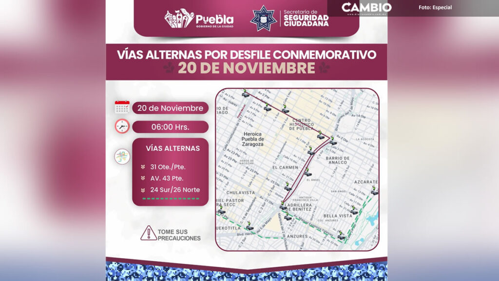 Debido a que estará restringido el flujo vial, se recomienda a la ciudadanía que transite por la calle 31 Oriente-Poniente; la avenida 43 Poniente y las vialidades 24 y 26 Sur.