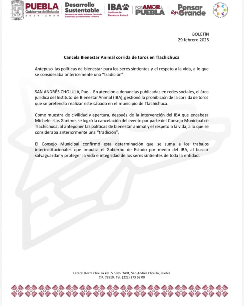 El Instituto de Bienestar Animal (IBA) de Puebla, a través de su área jurídica, logró la cancelación de una corrida de toros programada para este sábado en el municipio de Tlachichuca.