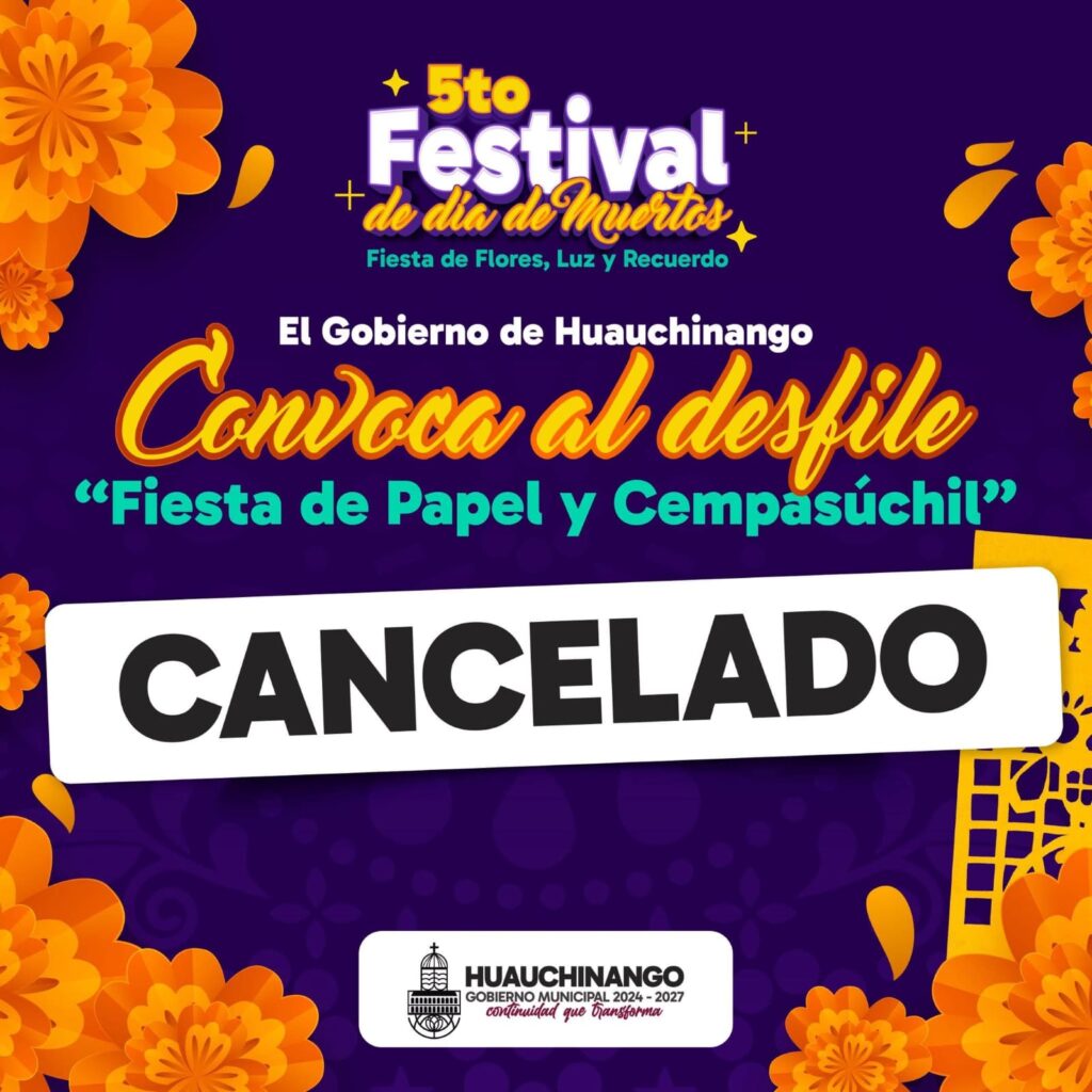 El Gobierno municipal de Huauchinango anunció la cancelación del 5to Festival de Día de Muertos, incluyendo el tradicional Desfile “Fiesta de Papel y Cempasúchil“, debido a las severas afectaciones causadas por las lluvias en el municipio y por respeto a las personas que perdieron la vida, así como las que perdieron sus pertenencias.