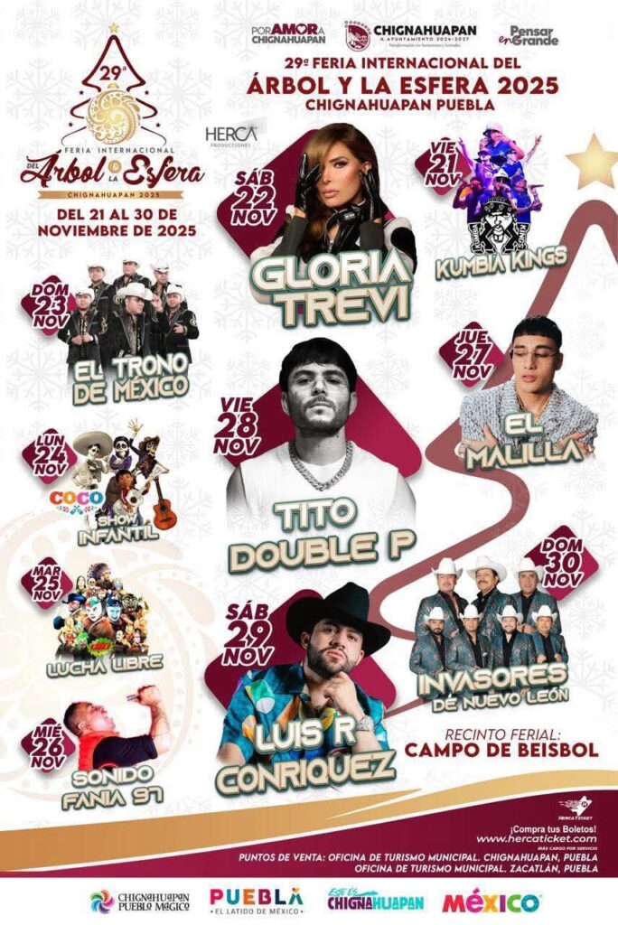 El gobierno municipal de Chignahuapan presentó su cartelera oficial de la 29ª Feria Internacional del Árbol y la Esfera, en la que se tendrán presentaciones estelares de Gloria Trevi, Los Invasores de Nuevo León, Tito Doble P, El Trono de México, Kumbia Kings y muchos más artistas.