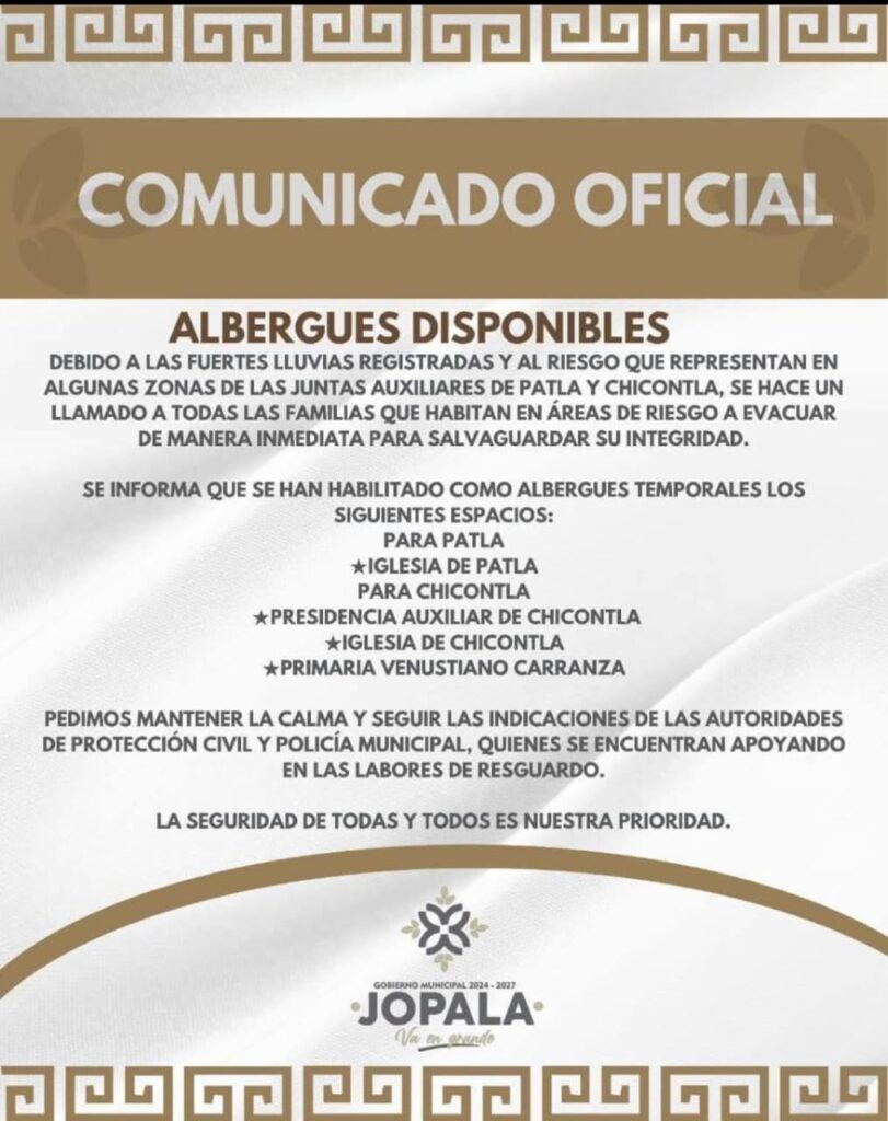 Ante el inminente riesgo, Protección Civil Municipal de Jopala ha emitido un llamado a todas las familias que habitan en áreas de riesgo en las juntas auxiliares de Patla y Chicontla para que evacúen de manera inmediata y salvaguarden su integridad.
