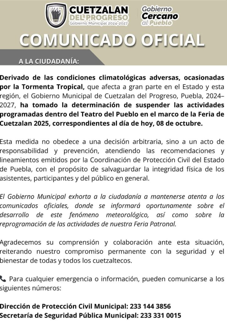 Debido a las condiciones climatológicas adversas provocadas por la Tormenta Tropical Jerry que afecta a la Sierra Norte de Puebla, el alcalde de Cuetzalan, Oscar Paula Cruz, suspendió las actividades de este día dentro del Teatro del Pueblo de la Feria Patronal 2025.