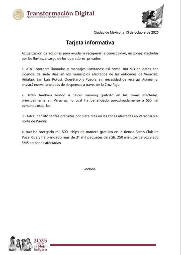 Esta iniciativa forma parte de un esfuerzo conjunto entre empresas privadas y autoridades locales para garantizar comunicación, asistencia y seguridad durante la contingencia climática, especialmente en comunidades aisladas o con daños en infraestructura.