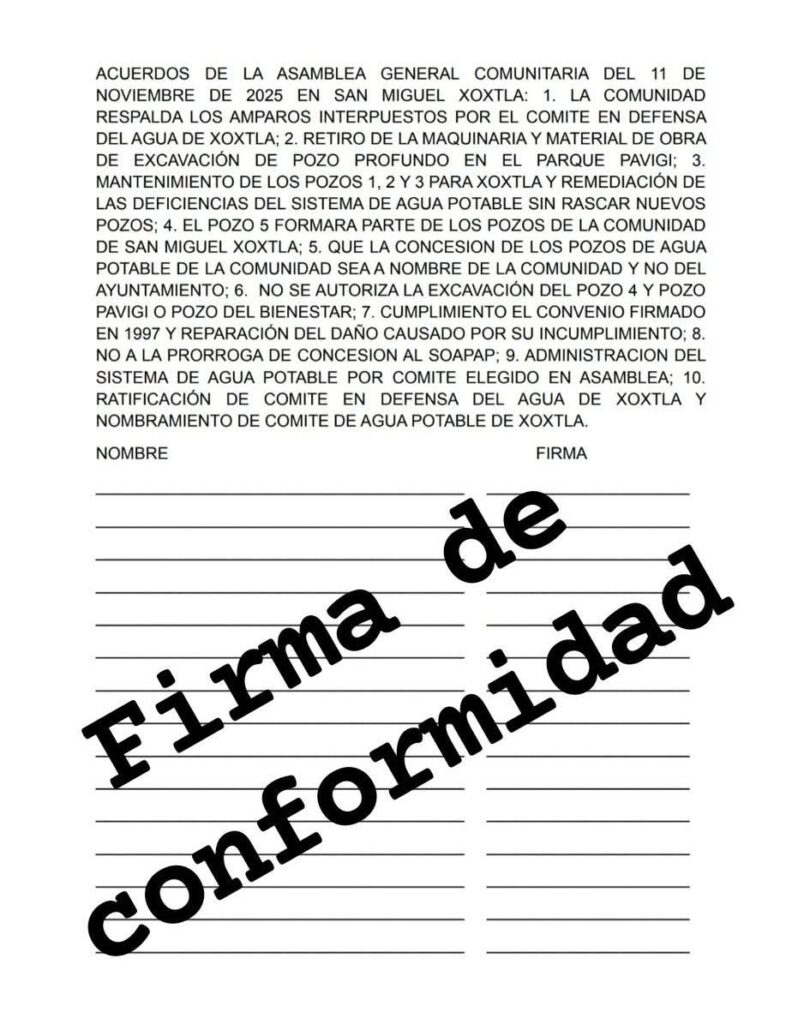 Tras la suspensión provisional de los trabajos de excavación del pozo Pavigi en San Miguel Xoxtla, autoridades locales y habitantes de la comunidad acordaron una serie de acciones relacionadas con el manejo y la administración del agua potable en la zona.