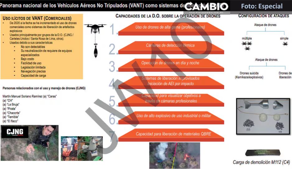En el reporte, la dependencia dio a conocer que los drones son utilizados con cámaras de detección térmica y se pueden volar de día y de noche, el uso de altas cargas explosivas de uso industrial o militar.