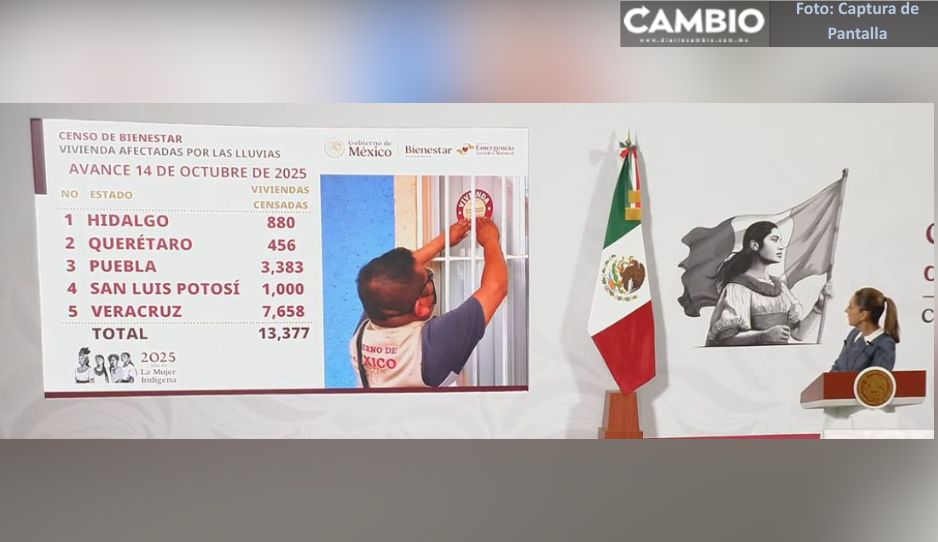 La presidenta de México, Claudia Sheinbaum, informó que en el estado de Puebla se han censado 3 mil 383 viviendas afectadas por la reciente contingencia ocasionada por las lluvias. En total, suman 13 mil 337 viviendas dañadas en los cinco estados impactados por el fenómeno.
