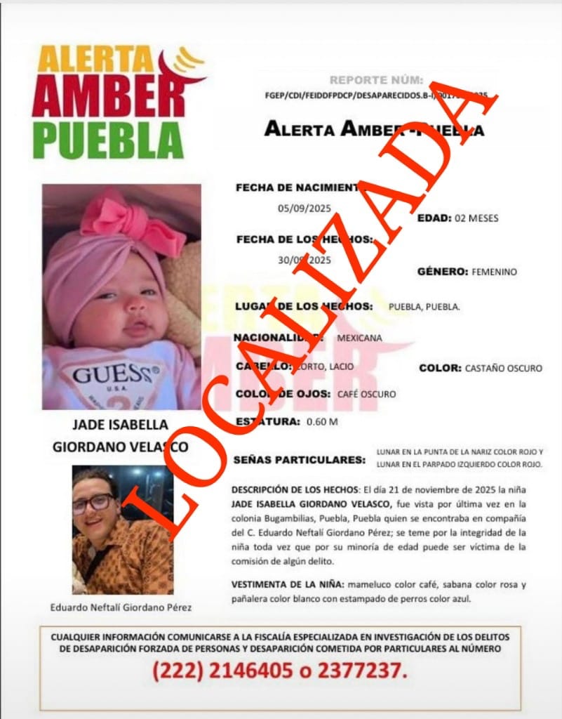 El corazón de una madre ya está en paz, luego de que le devolvieron a su bebé de dos meses, Jade Isabella Giordano Velasco, quien había sido reportada como no localizada desde el 21 de noviembre de este año, tras haber sido vista por última vez en la colonia Bugambilias.