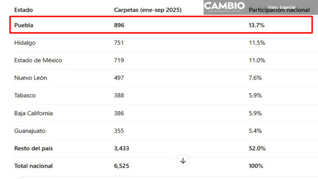 Por debajo de Puebla se ubicaron Hidalgo (751 carpetas), Estado de México (719), Nuevo León (497), Tabasco (388), Baja California (386) y Guanajuato (355).