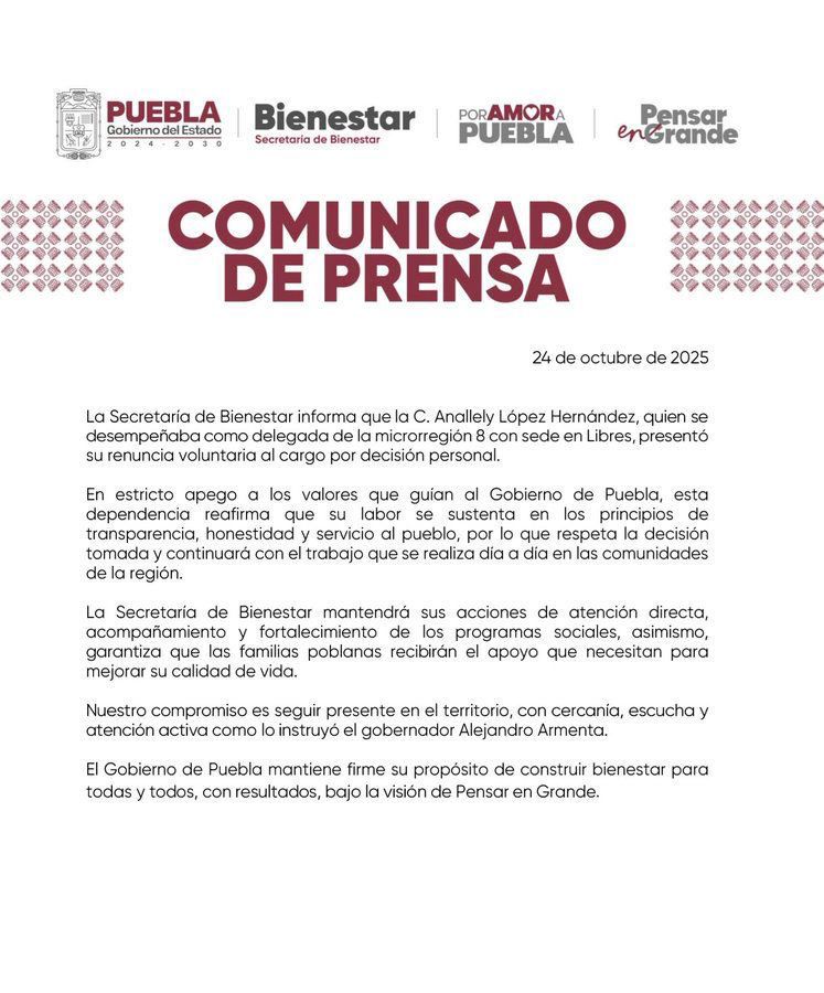 “La Secretaría de Bienestar informa que la C. Anallely López Hernández, quien se desempeñaba como delegada de la microrregión 8 con sede en Libres, presentó su renuncia voluntaria al cargo por decisión personal”, señala el documento.