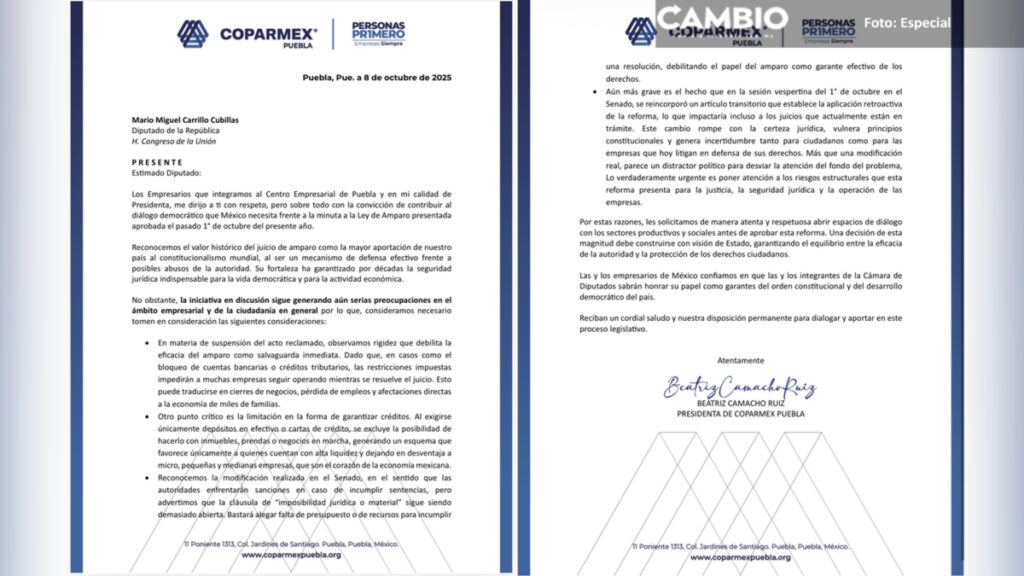 La Confederación Patronal de la República Mexicana en Puebla (COPARMEX Puebla) emitió un comunicado en el que exhortó a los diputados federales de Puebla del bloque aliado a la Cuarta Transformación a no aprobar la reforma de la Ley de Amparo sin antes dialogar con los sectores productivos y sociales del país.