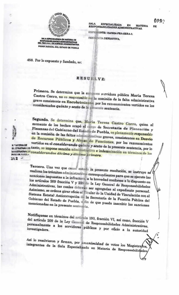 El fallo de la Sala Especializada en Materia de Responsabilidades Administrativas del Poder Judicial del Estado de Puebla asentado en el expediente 134/2024-PARA-SERA2 la declara plenamente responsable de los delitos de desvío de recursos públicos y abuso de funciones por la inversión ilegal en Accendo.