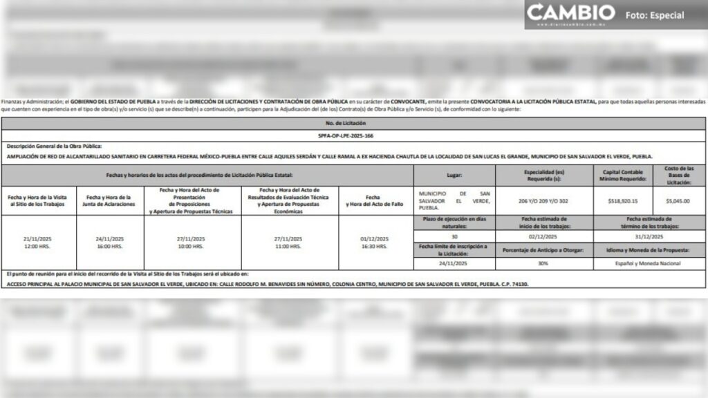 El Gobierno del Estado de Puebla lanzó la licitación pública SFA-OP-LPE-2025-166, destinada a la ampliación de la red de alcantarillado sanitario en un tramo de la carretera federal México–Puebla, a la altura de la localidad de San Lucas el Grande, en el municipio de San Salvador el Verde.