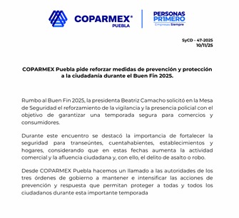 Ante la cercanía del Buen Fin 2025, la Confederación Patronal de la República Mexicana (COPARMEX) Puebla hizo un llamado a las autoridades a reforzar las medidas de prevención y vigilancia para garantizar la seguridad de comercios y consumidores durante esta temporada de alta actividad comercial.