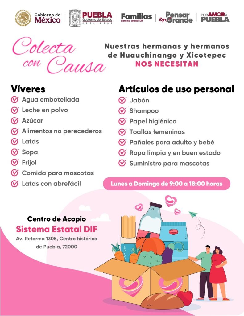 El Sistema Estatal DIF abrió la campaña “Colecta con Causa“, para recolectar víveres para las personas afectadas por las lluvias en los municipios de Huauchinango y Xicotepec.