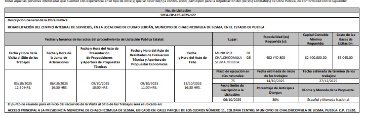Conforme la licitación con terminación 2025-127, se establece que las empresas interesadas en la rehabilitación Centro Integral de Servicios, en la localidad de Ciudad Serdán, municipio de Chalchicomula De Sesma, deberán de presentar sus propuestas el 9 de octubre de este año mientras que el fallo para conocer a los ganadores se dará a conocer el 13 de octubre.