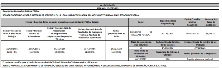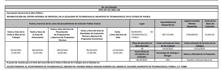 En el caso de la rehabilitación Del Centro Integral De Servicios, en la localidad de Tecamachalco, con el número de licitación SPFA-OP-LPE-2025-128, marca el mismo costo para adquirir las bases por 5 mil 045 pesos, sin embrago, deberá de contar con un capital mínimo de 700 millones de pesos.