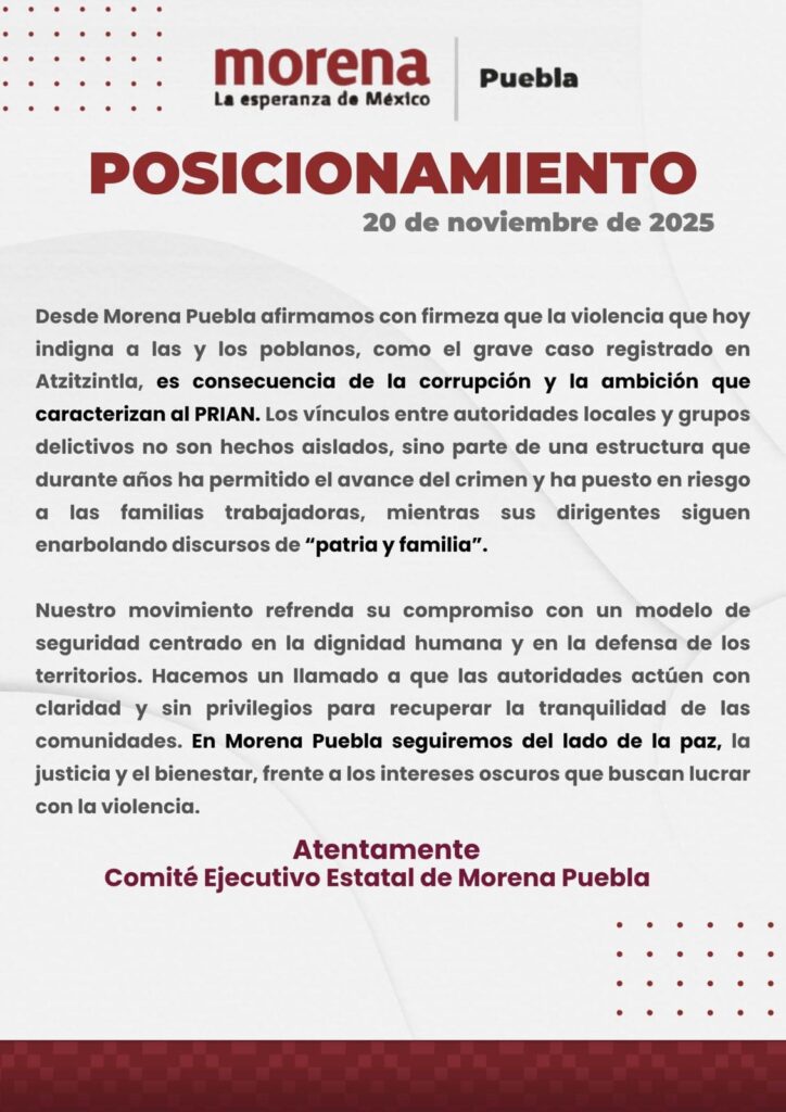 “Desde Morena Puebla afirmamos con firmeza que la violencia que hoy indigna a las y los poblanos, como el grave caso registrado en Atzitzintla, es consecuencia de la corrupción y la ambición que caracterizan al PRIAN” expresaron en el comunicado.