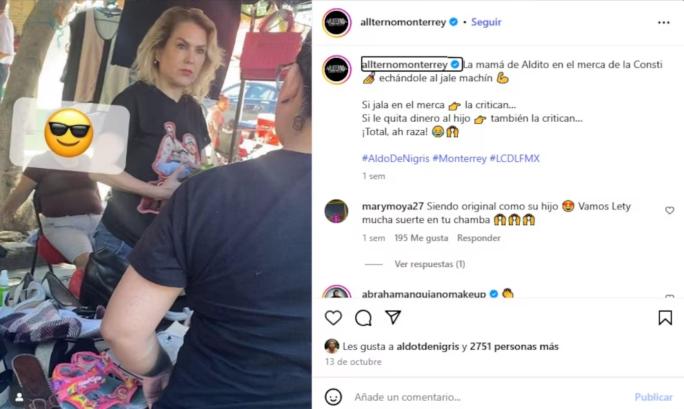 Leticia Guajardo, mamá del reciente ganador de La Casa de los Famosos México, Aldo de Nigris, fue captada mientras atendía un puesto de ropa, calzado y bolsas en un tianguis de Monterrey, conocido como “la Consti”.